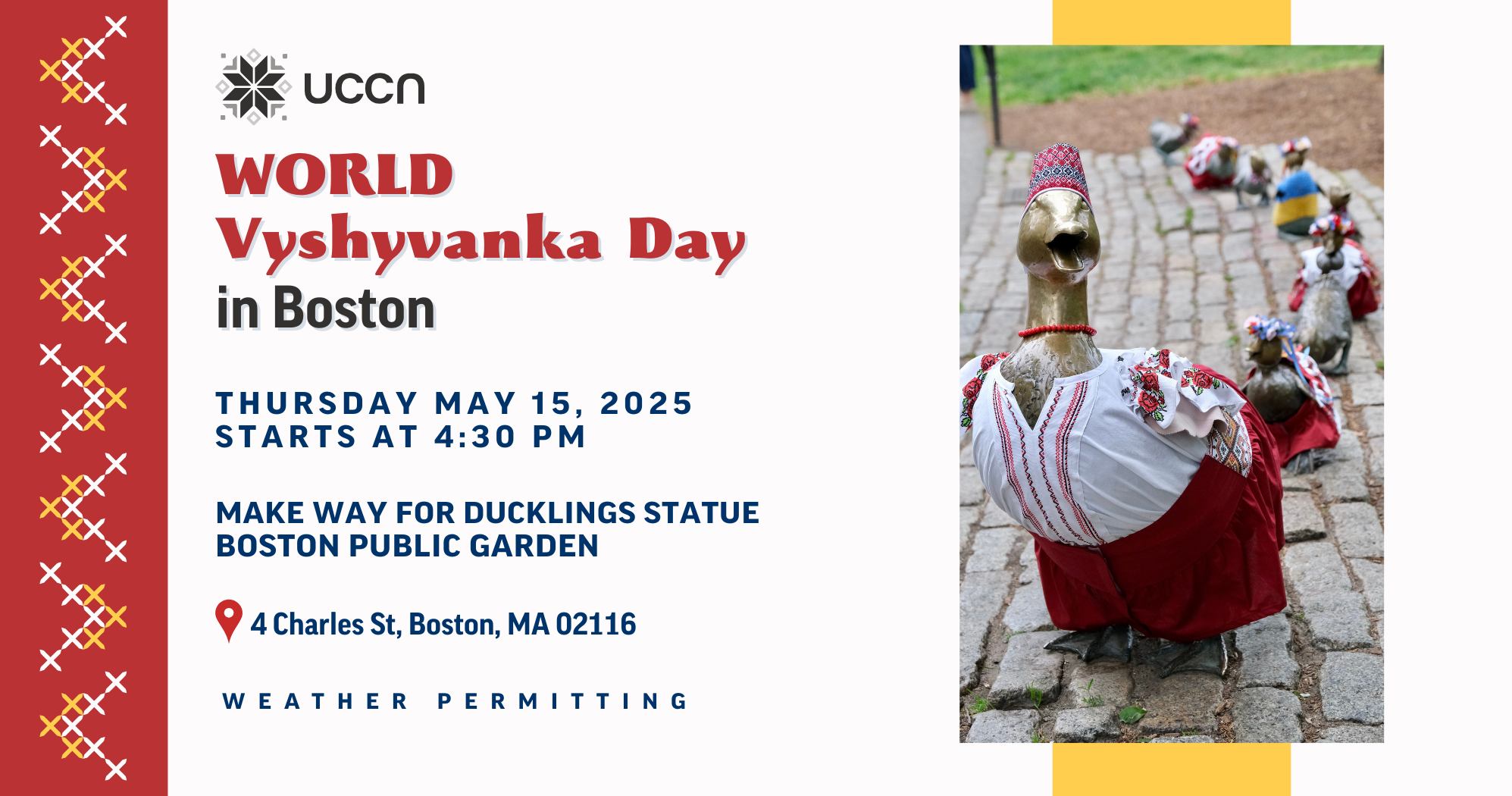 Please join us on Thursday, May 15, 2025, starting at 4:30 PM at Make Way for Ducklings Statue in Boston Public Garden to celebrate one of the most prominent symbols of Ukrainian culture – vyshyvanka!