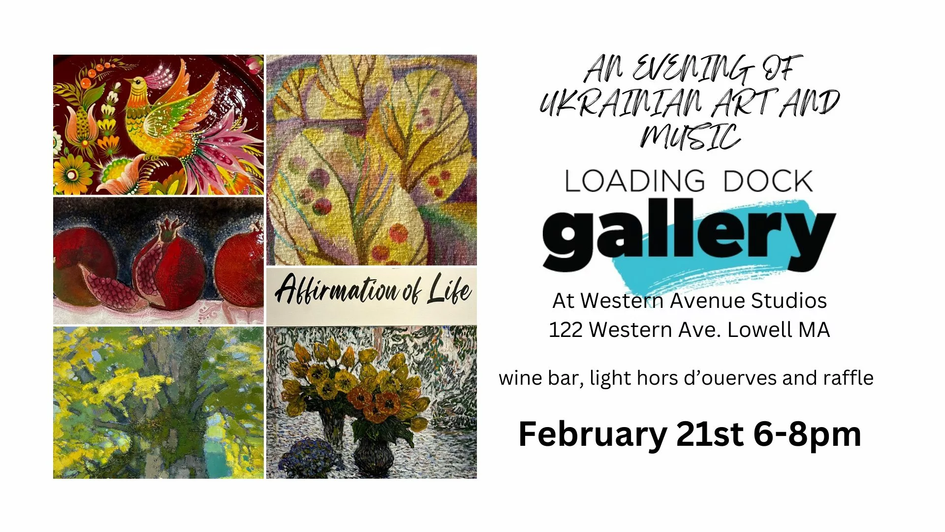 Please join us for this international show of Ukrainian art and music. Vice Mayor of Lowell, Paul Ratha Yem will introduce Nataliya Proskura and Vladislav Shapiro, the architects of this evening’s event. Vladislav will give a brief description of the artists and their artwork.