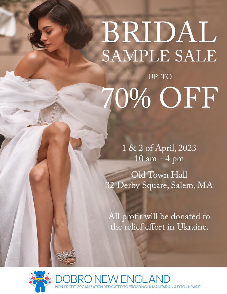 We are going to organize a Bridal Sample Sale Event where you can buy a wedding dress at a discount. All funds and donations go to Dobro, New England to provide humanitarian support for the people in Ukraine. The event will be at Old Town Hall in Salem, MA, on Saturday, April 1st, and Sunday, April 2d from 10 am to 4 pm.