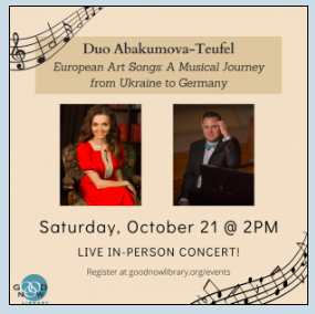 Join us for an IN-PERSON concert, “European Art Songs: A Musical Journey from Ukraine to Germany”, by Duo Abakumova-Teufel on Saturday, 10/21, at 2PM!