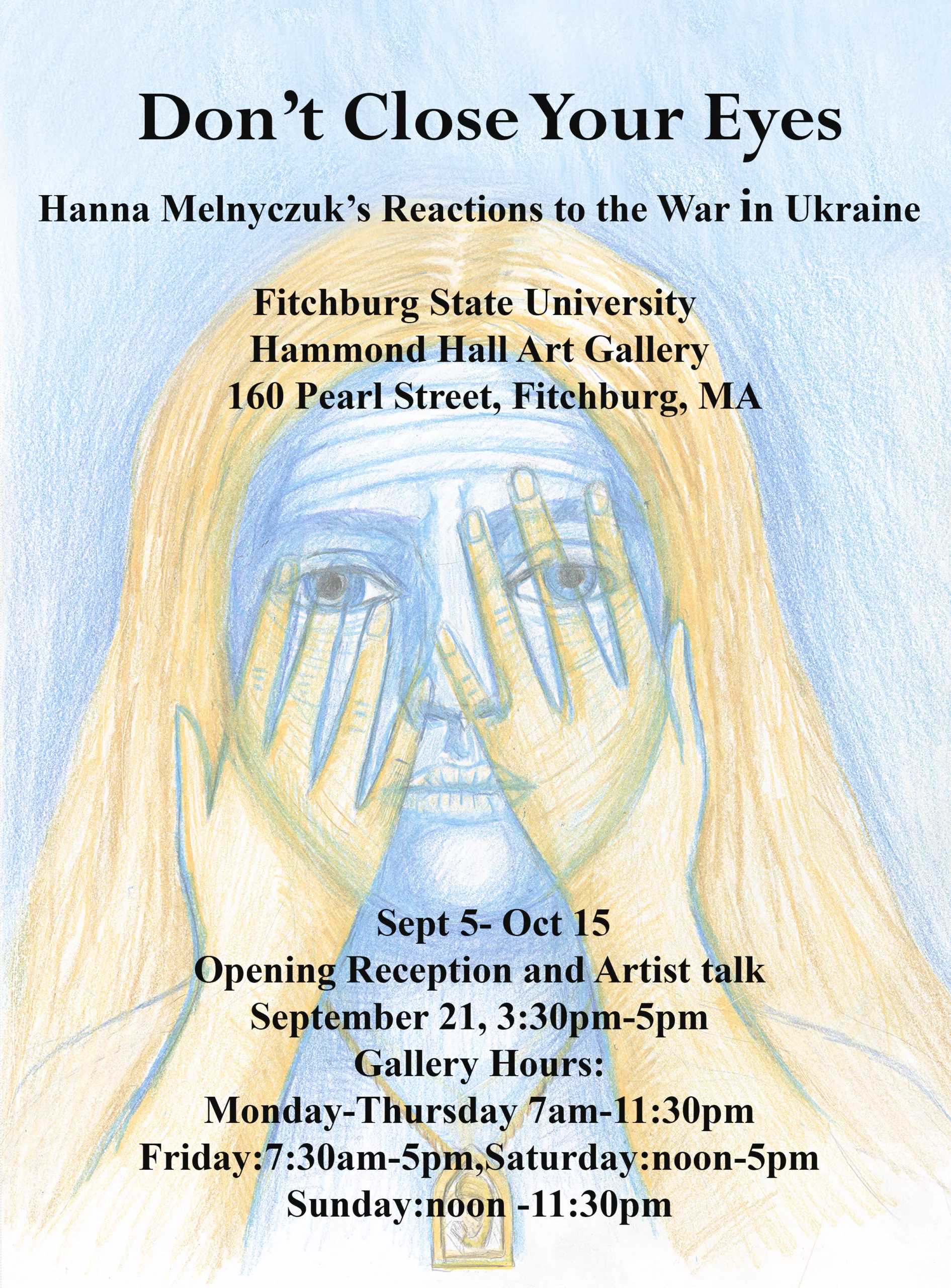 Hanna Melnyczuk’s “Don’t Close Your Eyes: Reactions to the War in Ukraine” will be on display at Fitchburg State University, Hammond Hall Art Gallery on Tuesday, Sept. 5 through Sunday, Oct. 15, with a reception at 3:30 p.m.