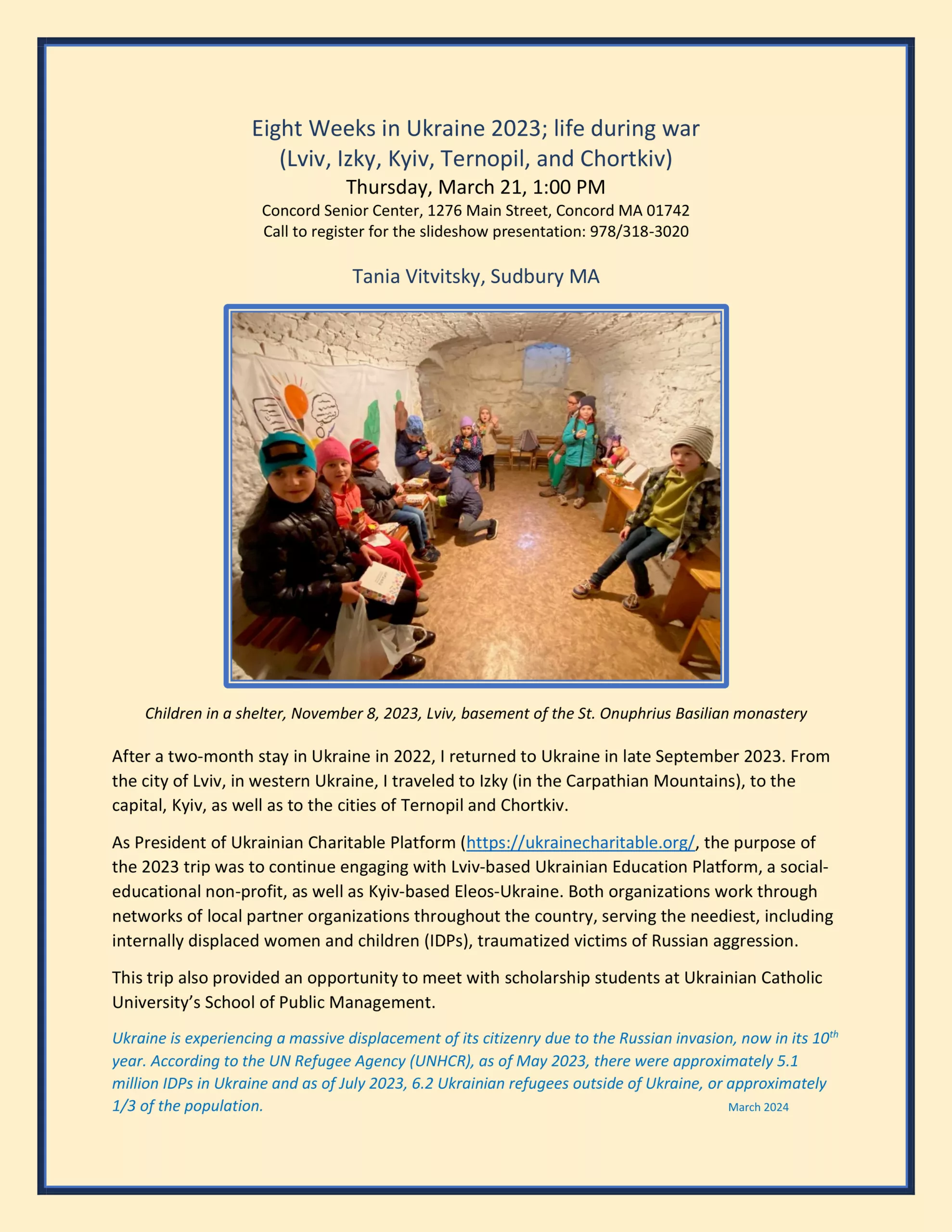 As President of Ukrainian Charitable Platform https://ukrainecharitable.org/ the purpose of the 2023 trip was to continue engaging with Lviv-based Ukrainian Education Platform, a social-educational non-profit, as well as Kviv-based Eleos-Ukraine. Both organizations work through networks of local partner organizations throughout the country, serving the neediest, including internally displaced women and children (IDPs), traumatized victims of Russian aggression.This trip also provided an opportunity to meet with scholarship students at Ukrainian Catholic University’s School of Public Management.