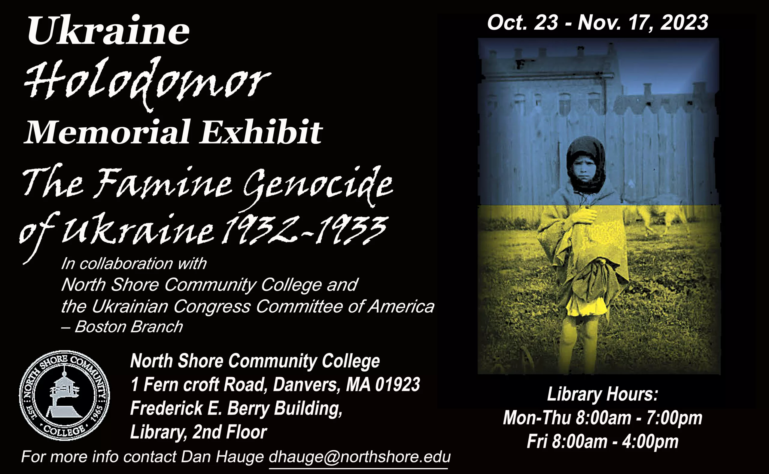 This year we are commemorating the 90th Anniversary of the Holodomor. A terrible famine orchestrated by Stalin’s regime to break Ukraine’s aspirations for nationhood. It failed, however, millions perished, and the nation is still feeling some of the effects of that tragedy. November is traditionally the month when we remember the victims. To begin this cycle, in collaboration with North Shore Community College the Ukrainian Congress Committee of America – Boston Branch has opened an exhibit of nine banners Providing pertinent information about the Holodomor, together with a short slide show and a resource desk at the community college library. The library is open to the public and there is ample parking.