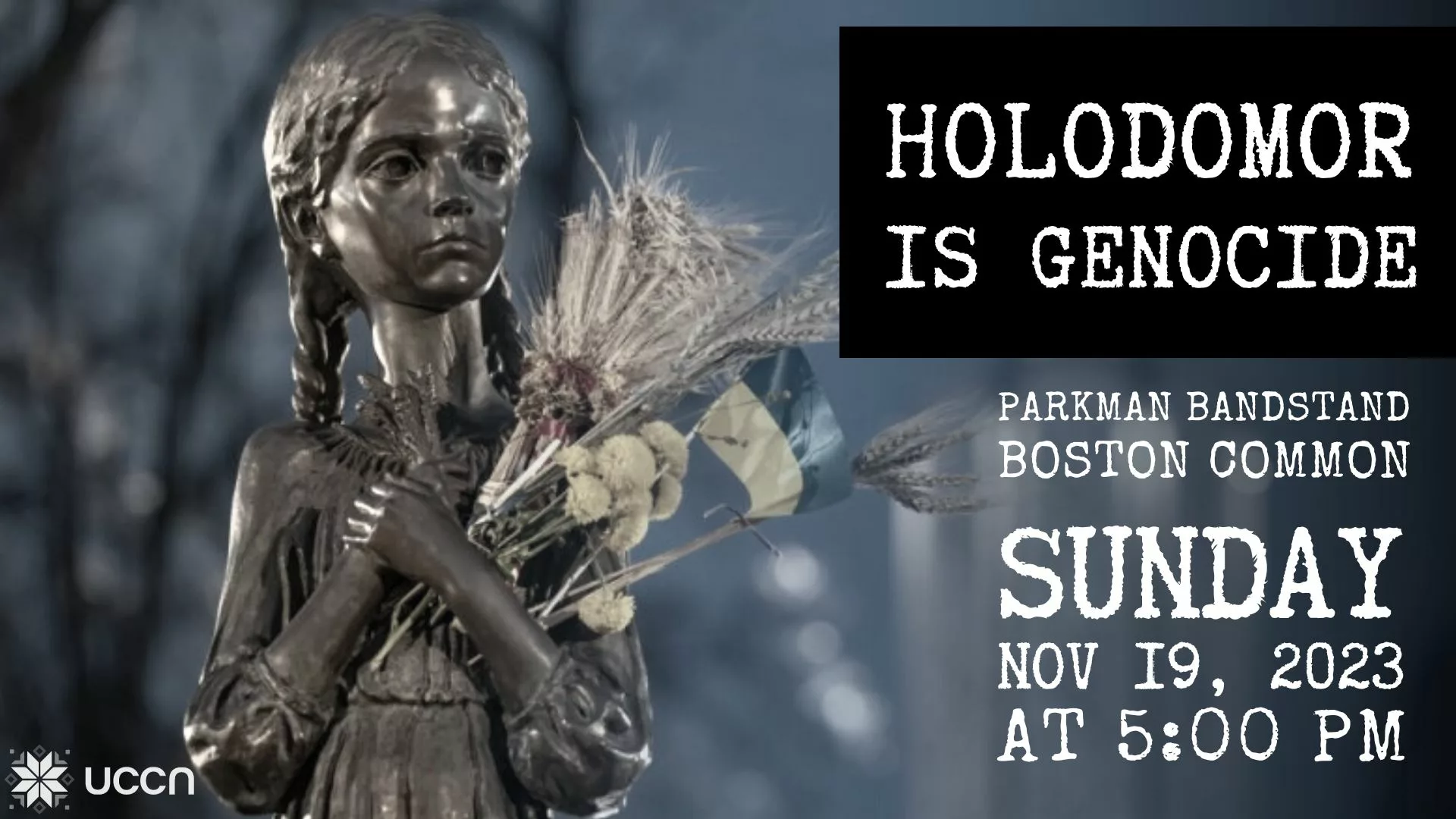 Запрошуємо Вас приєднатись біля відомого Parkman Bandstand на Boston Common для вшанування пам’яті мільйонів душ, втрачених від жорстоких штучних голодоморів в Україні. Ми вшановуватимемо пам’ять тих, хто постраждав від масового штучного голоду в 1921–1923 роках, Голодомору 1932–1933 років і штучного голоду 1946–1947 років.