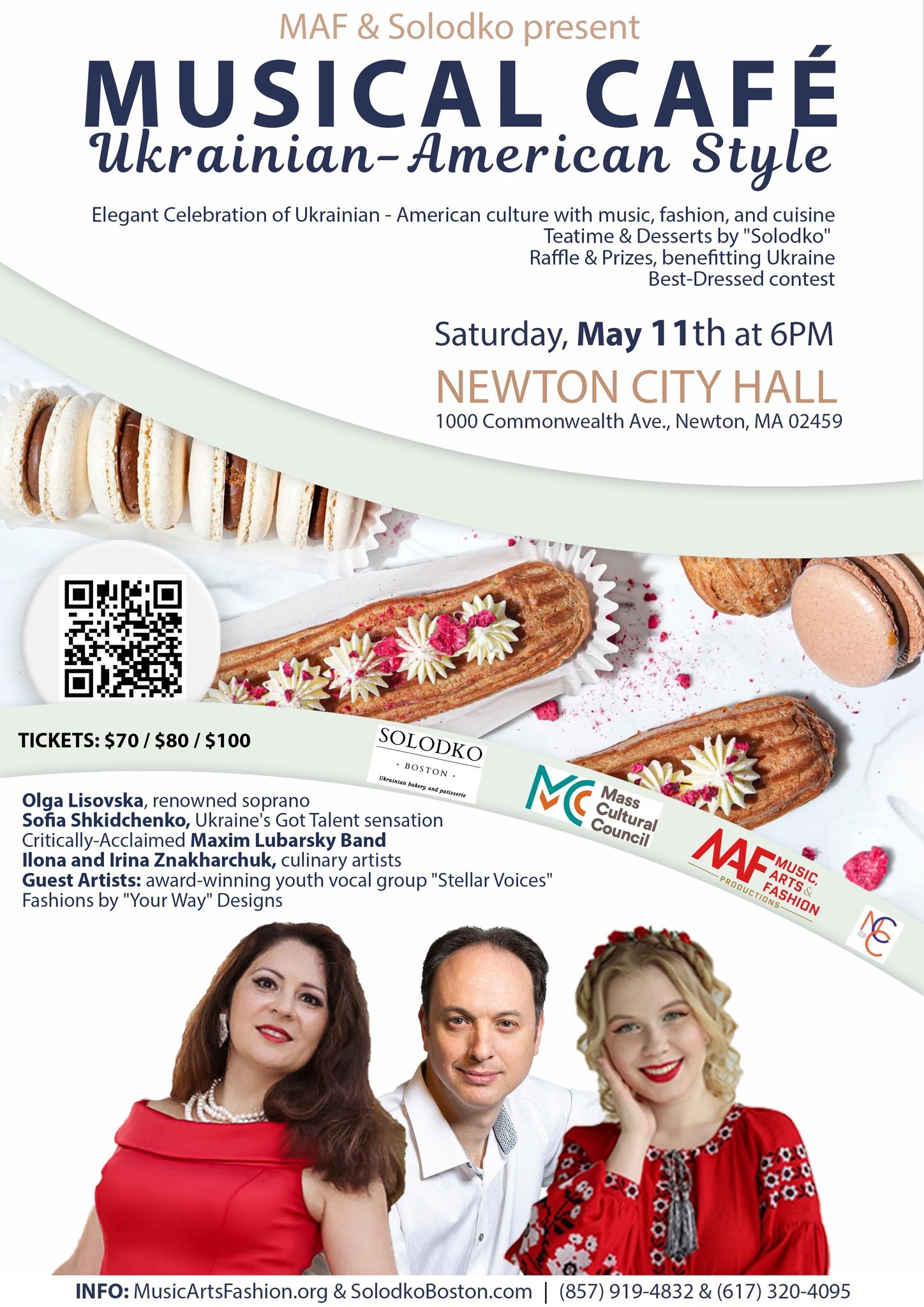 For the 7th consecutive year, Music, Arts & Fashion Productions proudly presents the highly anticipated Musical Café series. This year, MAF has partnered up with Solodko, Boston’s beloved Ukrainian bakery and patisserie, to present an evening of elegance and culture, inspired by Ukrainian music, fashion, arts, and culinary delights.