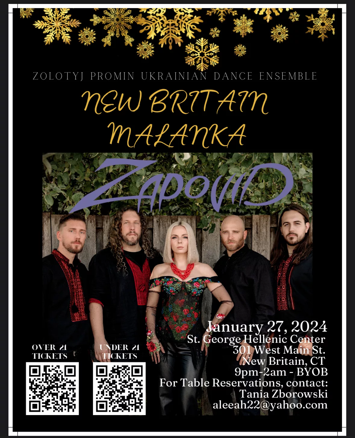 Join us Saturday, January 27, 2024 and celebrate Ukrainian New Year at the New Britain Malanka featuring ZAPOVID!