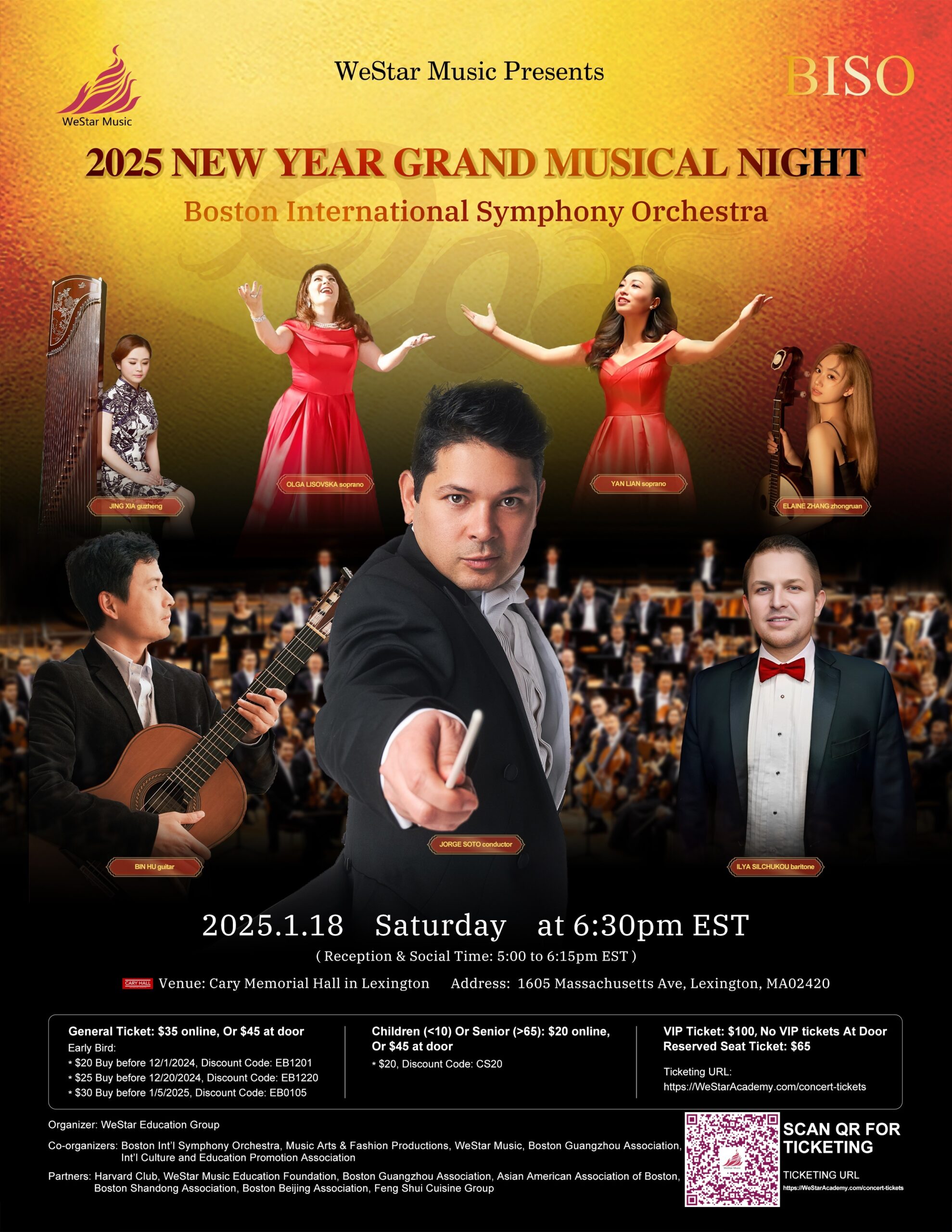 Join us on Jan. 18th, 2025 on this inaugural WeStar 2025 New Year Grand Musical Night, featuring Boston International Symphony Orchestra. The program will be uplifting and sparkly, with such favorites as Strauss’ waltzes, classical hits by Rossini, Offenbach, Donizetti, and others.