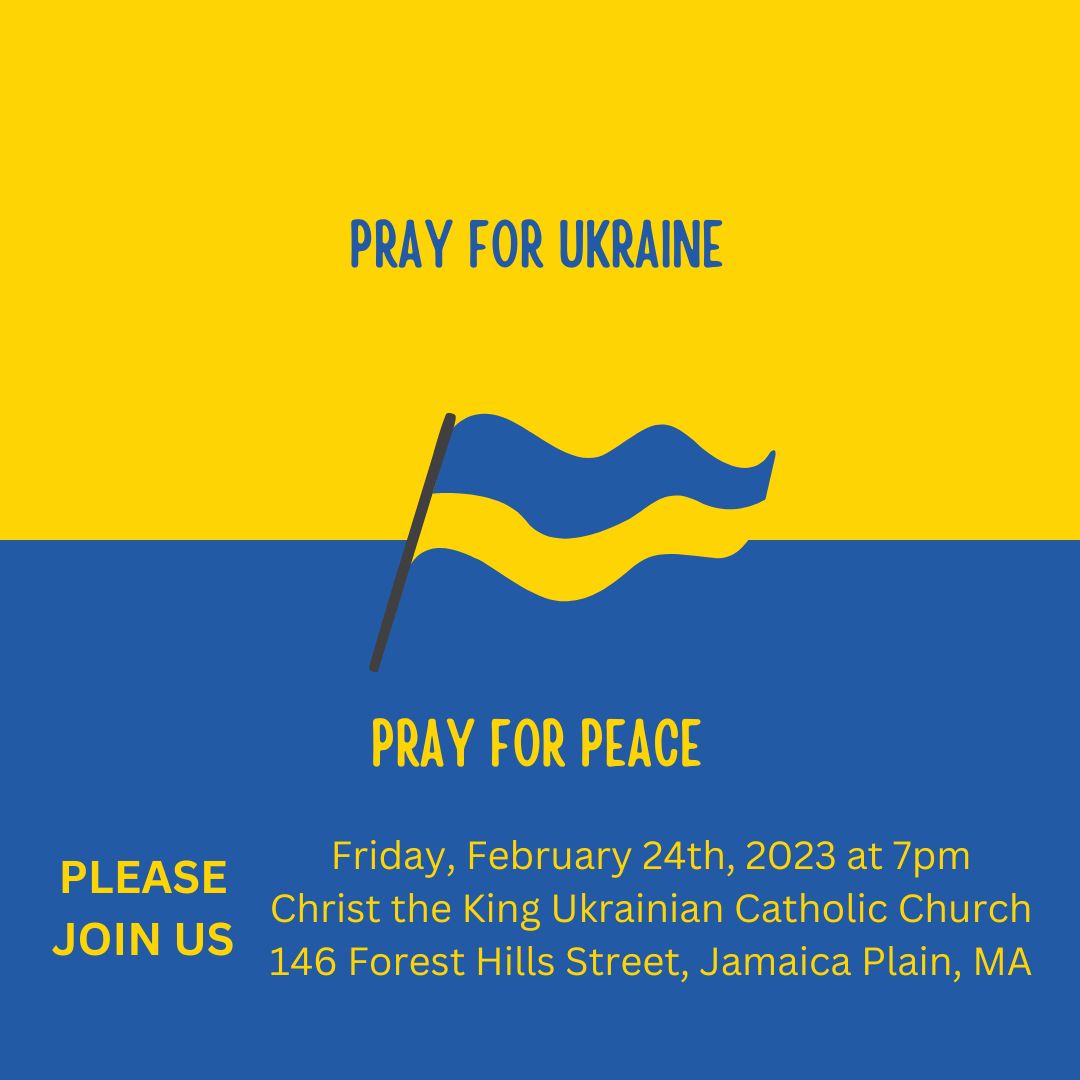 Christ the King Ukrainian Catholic Church in Jamaica Plain, MA invites you to a prayer service for peace in Ukraine this Friday, February 24th. 2023 at 7pm. This prayer service is timed to mark the one year anniversary of the start of the full scale war. Please invite your family, friends, co-workers, and neighbors to this community event to pray in solidarity with those facing the horrors of war. All are welcome.
