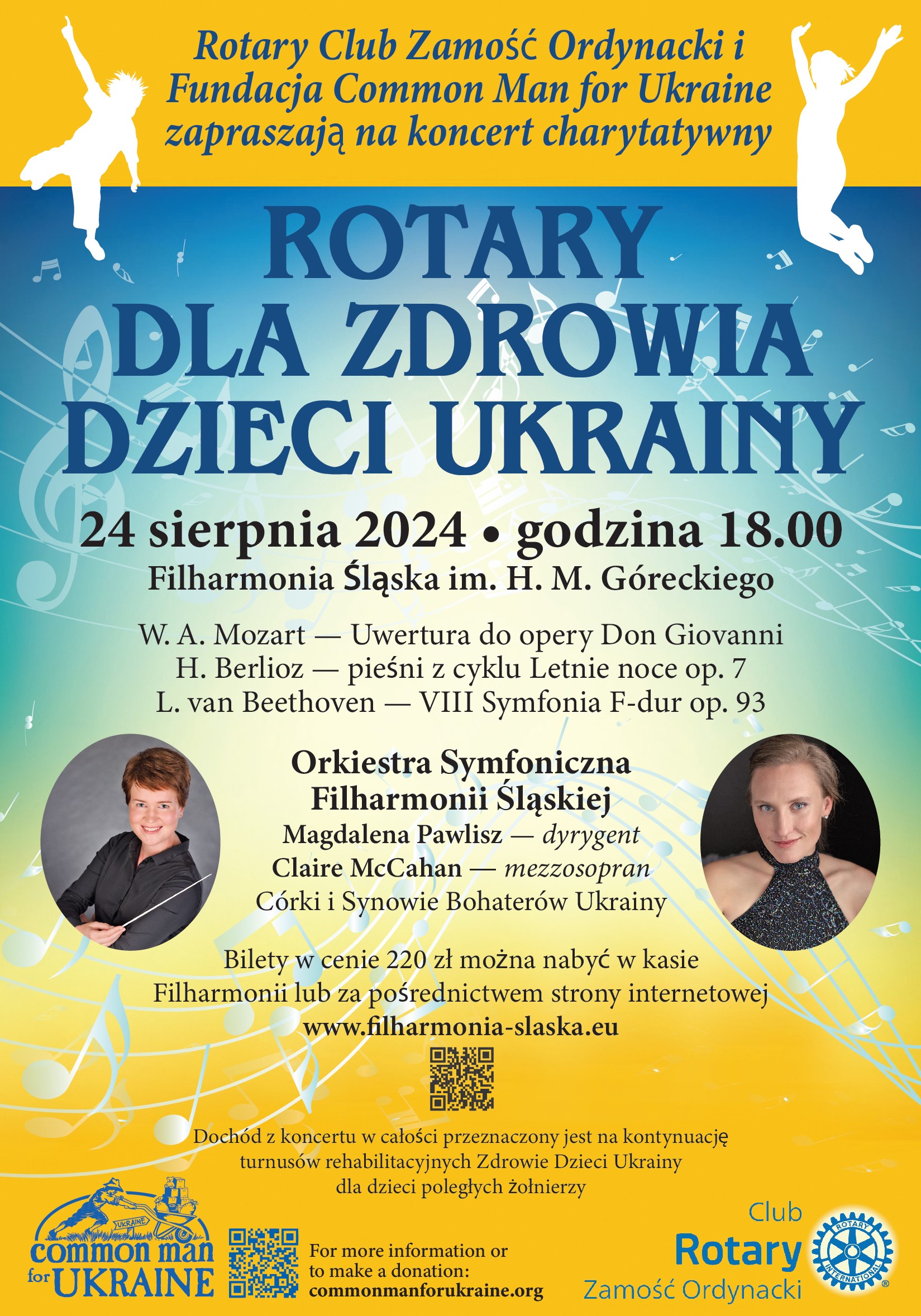 On August 24, 2024, on the 33rd anniversary of Ukraine’s independence, we invite you to a charity concert organized by the nonprofit Common Man for Ukraine, Rotary Club of Zamość Ordynacki and District 2231 Rotary International, with the support of Rotary Club of Katowice.