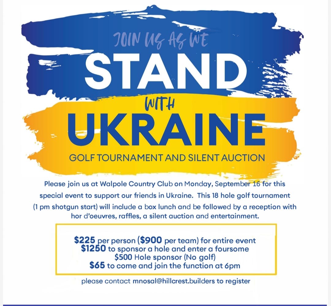 Please join us at Walpole Country Club on Monday, September 16 for this special event to support our friends in Ukraine. This 18 hole golf tournament (1 pm shotgun start) will include a box lunch and be followed by a reception with hor d’oeuvres, raffles, a silent auction and entertainment.