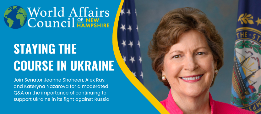 In light of the recent discussions surrounding the importance of continued support for Ukraine, join the World Affairs Council of New Hampshire’s global community for a moderated conversation with U.S. Senator Jeanne Shaheen, Kate Nazarova, and Alex Ray. This global discussion, centered in New Hampshire, will provide insights into how NATO and its allies have provided vital support to Ukraine in its fight against Russia, why they continue to do so, and what is at stake for the world if Russia is allowed to complete its war of annexation.