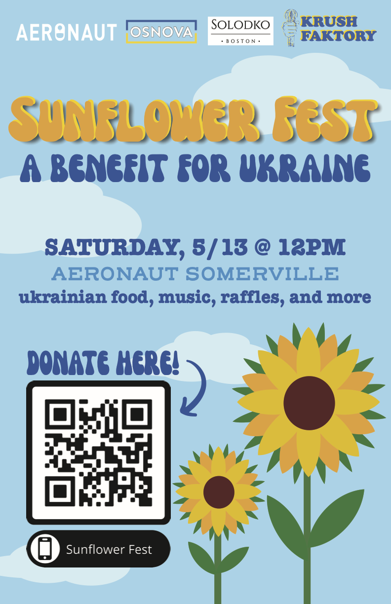 SUNFLOWER FEST: A BENEFIT FOR UKRAINE! Join Osnova at Aeronaut on SATURDAY 5/13 starting at 12pm for a celebration of all things Ukraine; from a live performance by Ukrainian pianist, Maxim Lubarsky, to delicious Ukrainian treats from Solodko Boston, we can’t think of a better way to generate awareness of and support for this important cause!