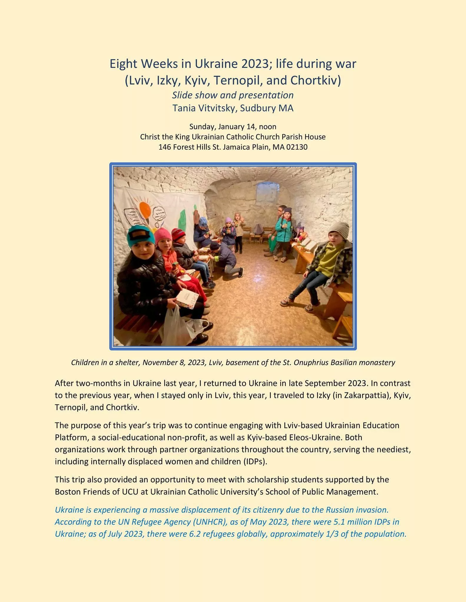 Tania Vitvitsky: Eight Weeks in Ukraine 2023; life during war (Lviv, Izky, Kyiv, Ternopil, and Chortkiv) Slide show and presentation.