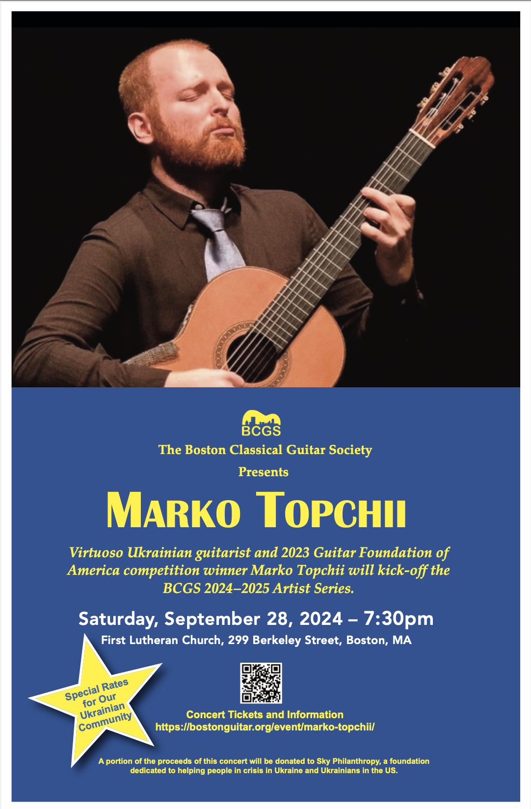 Virtuoso Ukrainian guitarist and 2023 Guitar Foundation of America competition winner, Marko Topchii is one of the best classical guitarists in the world! He prepared a beautiful program of Bach, Ravel, Poulenc and other composers. One of the highlights of the program is “Carpathian Rhapsody” by a Ukrainian composer A. Shevchenko. Special discounts for Ukrainians: FREE tickets for the Ukrainians on the U4U program, discounted tickets for members of the Ukrainian community.