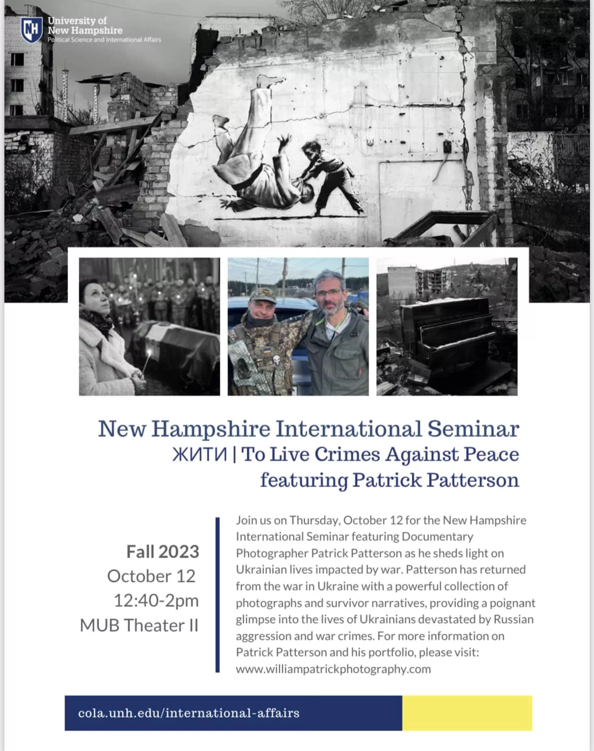 Join us on Thursday, October 12 from 12:40-2pm in MUB theater II as welcome documentary photographer Patrick Patterson to campus to talk about his experiences working amidst the conflict in Ukraine.