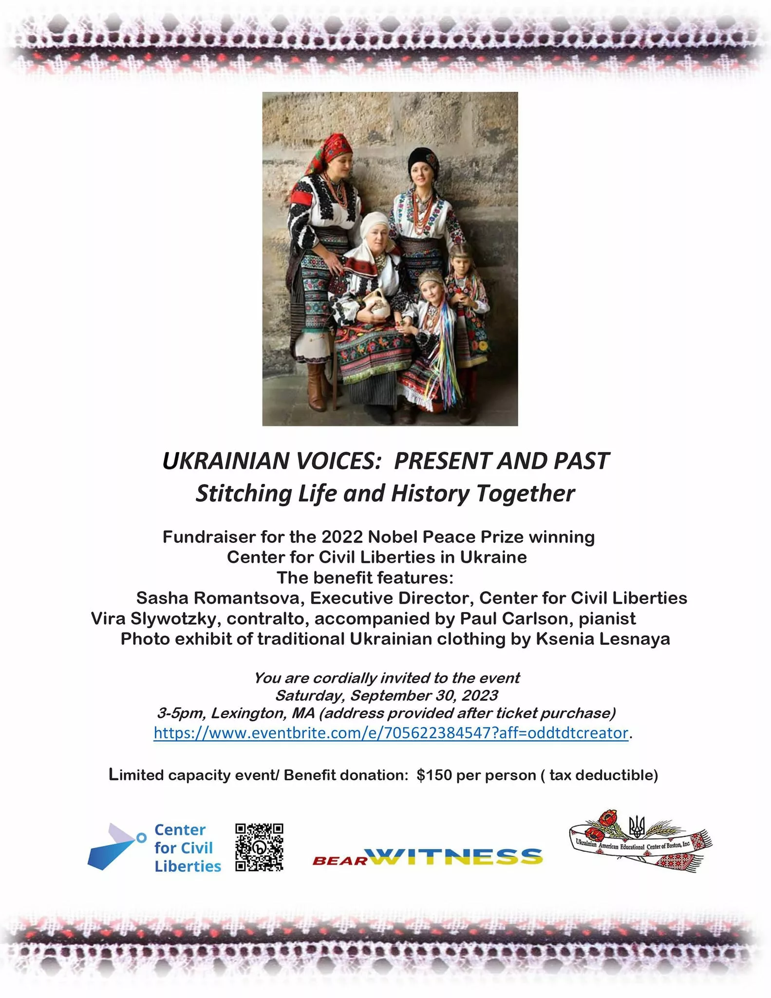 This timely and relevant world-class event is a ticketed fundraiser for the Center for Civil Liberties, the 2022 Nobel Peace Prize winner. CCL is the first Ukrainian organization to receive the Nobel Peace Prize. The ticket purchase price is tax-deductible as permitted under US IRS regulations.